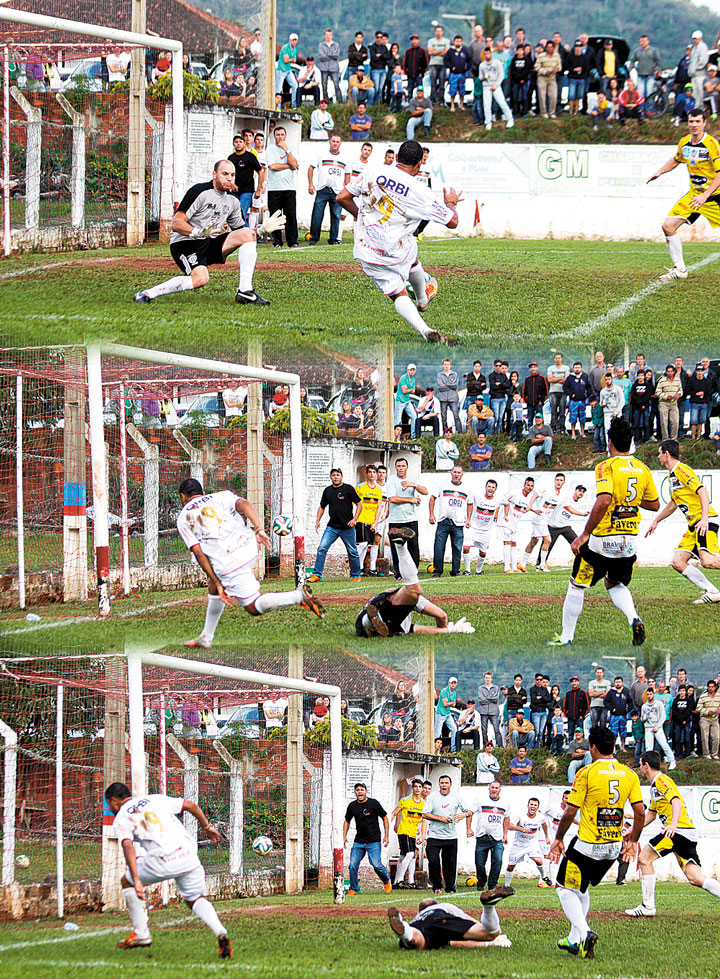 Numa jogada de velocidade e muita categoria, Bruninho abriu o marcador para o Santa aos 30 minutos (foto), dando a nítida impressão que o título viria com relativa facilidade. Ledo engano, pois o Unidos foi buscar o empate ainda no primeiro tempo, aos 44, com Touro, assinalando de cabeça. A igualdade no placar era suficiente para o clube visitante que havia vencido o jogo de ida das finais na Cohab por 2 a 1. Porém a tarde era mesmo do ótimo jogador Bruninho que viveu um dia de herói. O jogador blumenauense marcou mais três gols na segunda etapa, muito movimentada e emocionante, e onde o árbitro Edson da Silva teve intenso trabalho, mas que, com competência, soube levar o jogo até o seu final.