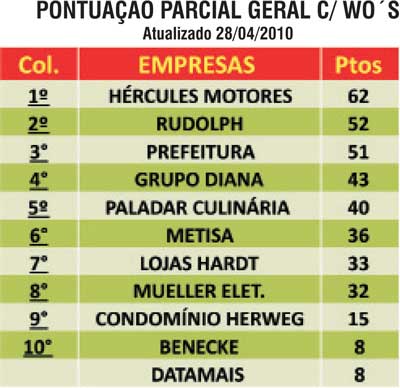 Timbó – Apenas uma modalidade foi encerrada esta semana na Olimpíada Entre Empresas de Timbó até o fechamento desta edição(5ªF/22h).Foi a bocha livre, no naipe feminino, que acabou conquistada pelo Grupo Diana. Na decisão, na quarta, 28, na ASPMT, Daizir e Magrid venceram Andrea e Lurdes depois Luciana, por 12 a 04. Já o terceiro lugar ficou com Renata e Sueli(Ivone), da Tecnoplast. Hoje(30) acontecem os jogos das semi-finais e finais do handebol masculino. Jogam a partir das 19h, Grupo Diana x Rudolph e depois Mueller Eletro x Metisa. Os vencedores decidem o título da modalidade. A bocha Raffa Vollo masculinotambém teve sequencia na AMB Nações, na quarta, com os jogos Policia SC 12 x 03 Vidraçaria Pérola, Prefeitura 12 x 01 Acrilan, Benecke 08 x 12 Mueller Fogões, Rudolph 07 x 12 Mueller Eletro e Lojas Hardt 12 x 08 Grupo Diana. As partidas da terceira rodada da 1ª fase prosseguem hoje a partir das 19 no mesmo local. Já no Ginásio do Complexo Esportivo Hans Muller acontece mais uma rodada do voleibol feminino. Na quarta-feira tivemos Paladar 2 x 1 Prefeitura, Panificadora Bom Dia 0 x 2 Grupo Diana e Dikruger 2 x 0 Malhas Wilson.