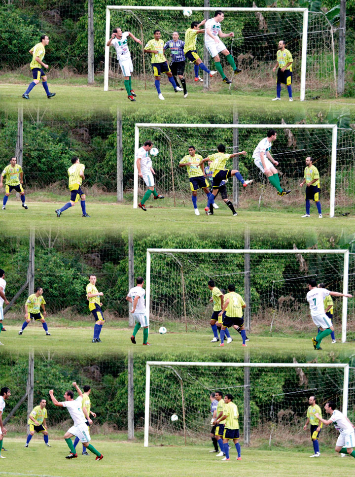 TIMBÓ – Extremo equilíbrio. Assim pode se explicar os empates nos jogos de ida da fase semifinal do 25º Campeonato Municipal de Futebol de Timbó, realizados neste domingo, dia 3. Em Tiroleses, o time da casa foi surpreendido pelo cinquentenário Água Verde logo no início (6m) da primeira etapa com o gol de Felipe. O meia do Verdão fez de cabeça (foto dir) concluindo a cobrança de um escanteio pela direita do ataque do Verdão. Atrás no marcador, o Tiroleses/DataM@is partiu pra cima dos visitantes, porém, mesmo com mais iniciativa ofensiva e posse de bola foi para o intervalo em desvantagem no placar.