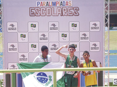 SÃO PAULO – A Paralímpiada Escolar Brasileira de 2012, reuniu em São Paulo, de 15 a 19 de outubro, cerca de 1,2 mil paratletas. Deste total , 150 foram catarinenses e disputaram medalhas e primeiras colocações nas modalidades de atletismo, bocha, futebol de sete, goalbol, judô, natação, tênis de mesa, tênis de cadeira de rodas e vôlei sentado. Timbó marcou presença com o paratleta da Escola São Roque, Carlos Henrique Gessner (foto centro) que esteve acompanhado pelo seu treinador Cristiano Largura. Com 13 anos, Gessner enfrentou adversários com até 15 anos e mesmo assim, a sua performance foi sensacional foi primeiro lugar nos 300 metros rasos (1min01seg71) e no arremesso de pelota (20m93) e segundo, nos 100 metros rasos (17seg55).
