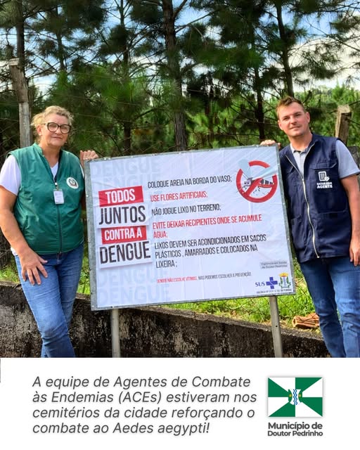 Em uma iniciativa para intensificar o combate ao Aedes aegypti, mosquito transmissor da dengue, zika e chikungunya, a equipe de Agentes de Combate às Endemias (ACEs) realizou um mutirão de prevenção nos cemitérios de Doutor Pedrinho. A ação teve como objetivo conscientizar a população e eliminar possíveis focos do mosquito em locais que, devido ao acúmulo de água em vasos e outros recipientes, podem se tornar criadouros.