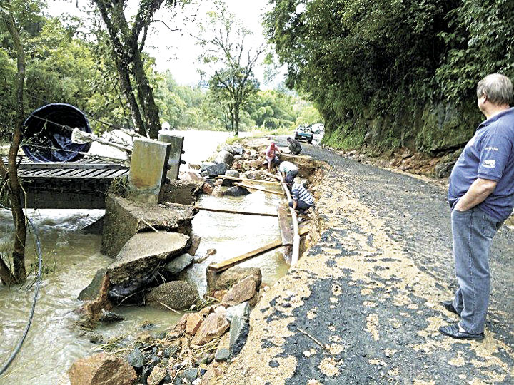 BENEDITO NOVO – Uma trégua após dois dias de intensa chuva, foi a oportunidade que a comunidade de Benedito Novo precisava para começar a limpar e organizar localidades e pontos atingidos pelas águas torrenciais. Segundo informações repassadas pelo secretário do planejamento, Luiz Carlos Marcello e o técnico da Defesa Civil, Flávio Holdorf, a Administração Municipal se uniu a comunidade para realizar o processo de recuperação. Após a chuva dar sua trégua, pôde ser observada a mobilização na cidade. “Ao todos, nós tivemos 57 residências atingidas, resultando no mesmo número de famílias desabrigadas. Dessas, três foram direcionadas para um abrigo, mas já estão voltando para suas moradias”, explica Holdorf, acrescentando que as mesmas estão recebendo auxílio da prefeitura e da Defesa Civil.