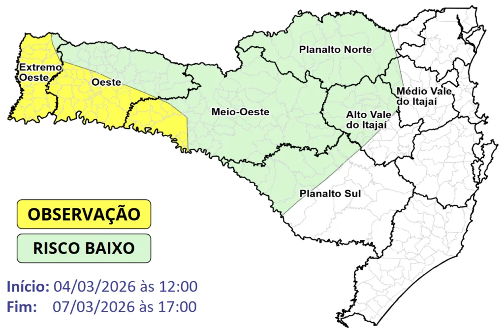 Entre esta quarta-feira (04) e o sábado (07), os dias serão marcados por calor intenso durante as tardes, sobretudo no Grande Oeste onde uma massa de ar quente atua com maior intensidade. As temperaturas máximas passam dos 35°C, no Oeste e Extremo Oeste, chegando pontualmente aos 38°C, resultando em risco baixo a moderado para ocorrências associadas ao calor intenso. No restante do estado as tardes também serão quentes, porém as máximas passando dos 30°C, podendo chegar a 33/34°C em áreas do Planalto Norte e parte do Vale do Itajaí.