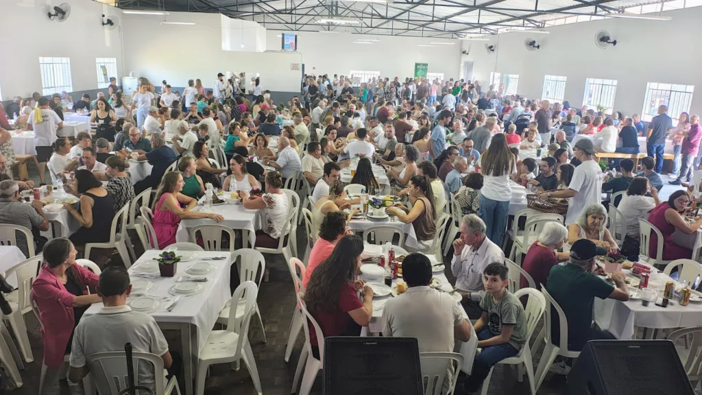 O espaço também registrou grande presença de público. Voluntários da própria comunidade, entre jovens e adultos, atuaram no atendimento das mesas e na distribuição dos alimentos e bebidas.