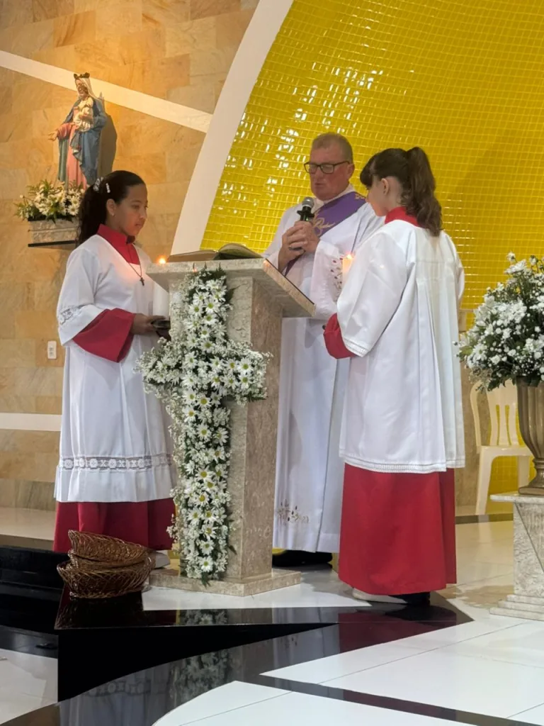 Outro destaque foi a decoração preparada pelas lideranças da comunidade, com arranjos florais e lírios brancos formando grandes cruzes. A histórica imagem de São José, posicionada ao lado do altar, também recebeu ornamentação especial.