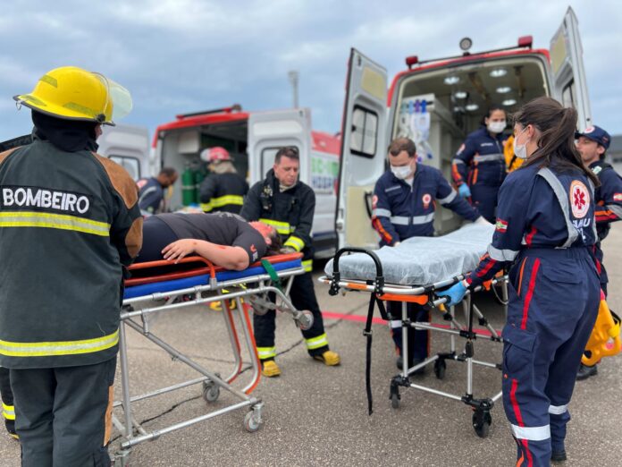 As equipes do Serviço de Atendimento Móvel de Urgência (Samu) de Santa Catarina participaram do simulado de acidente de avião com o Corpo de Voluntários de Emergência (CVE), no aeroporto de Florianópolis, nesta quinta-feira, 28 de novembro. O simulado é de responsabilidade do aeroporto e conta também com o apoio da Polícia Militar de Santa Catarina (PMSC), Organizações de Bombeiros Militar (OBM), Defesa Civil, equipes de resgate e emergência, entre outros.