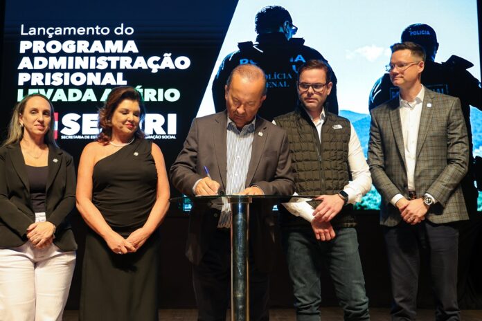 Em uma demonstração de força e planejamento estratégico, o Governo de Santa Catarina detalhou nesta terça-feira, 15, o programa Administração Prisional Levada a Sério. O governador Jorginho Mello anunciou um investimento histórico de R$ 1,4 bilhão a ser aplicado no sistema penitenciário estadual nos próximos três anos — o maior atualmente em andamento no Brasil. Ele esteve acompanhado da vice-governadora, Marilisa Boehm e da secretária de Estado de Justiça e Reintegração Social, Danielle Amorim Silva, além do secretário adjunto da pasta, Leandro Lisboa.
