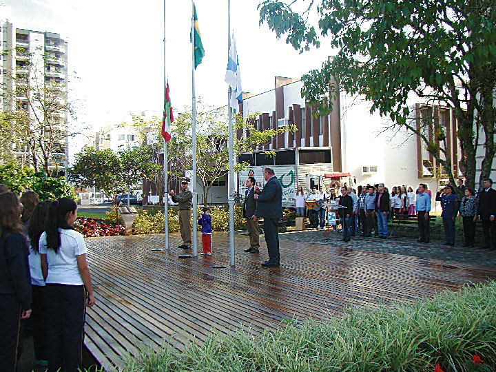 Dentro da solenidade de abertura da Semana da Pátria, a aluna Suiane Krueger, da Escola Municipal São Roque declamou o poema “Pátria, o que diz nosso hino”. Após iniciaram os pronunciamentos, primeiro do secretário de Educação, Sergi Mengarda, seguido pelo presidente do Legislativo, vereador Rubens Borchardt, que pronunciou algumas palavras sobre a importância da data para os brasileiros e o prefeito Laércio Schuster Junior, que declarou aberta a Semana da Pátria 2013. Para encerrar o evento, os alunos do 1º ano 3 da EEB Ruy Barbosa cantaram o Hino da Independência e a Banda Municipal Professor João Müller tocou o Hino do Município.