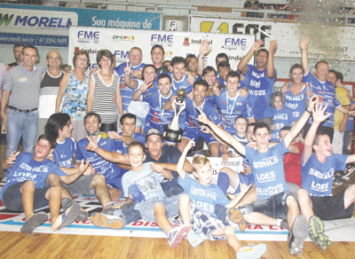 INDAIAL – Um espetáculo digno das boas tradições do Torneio de Verão de Indaial marcou a decisão da 28ª edição do certame de Futsal da FME local, no sábado, dia 2, no Ginásio Sérgio Luiz Petters. O Loes/HLS Ferragens, de Blumenau e o Cachorrões/Manos Veículos, de Indaial, mostraram aos 1.007 torcedores pagantes (renda-R$10.035,00) tudo o que se espera de uma final de campeonato – técnica, tática, raça, gols e muita, muita emoção. As viradas de placar e a intensa vibração das torcidas organizadas rivais também foram destaques do memorável confronto. E, após os 40 minutos regulamentares, ótimamente apitados por Jean Telles e João Antonio, a Taça Alveri "Leco" Brandell (em memória) acabou de forma invicta com a equipe blumenauense. A vitória por 6 a 5, rendeu a equipe do técnico Egidio da Costa Beckauser o seu segundo título seguido (venceu em 2012) e terceiro na história da competição( ganhou também em 2008). A campanha vencedora do Loes apresentou oito vitórias e apenas um empate, com 52 gols assinalados e 20 sofridos. Já o Cachorrões venceu seis, empatou uma e perdeu duas. Fez 44 gols e sofreu 27. Além de troféu e medalhas, o campeão embolsou R$10 mil de premiação. Na preliminar, o FPL, de Rodeio, venceu a Gráfica 3 de Maio, de Blumenau, por 7 a 4 e ficou em terceiro lugar. A artilharia do certame ficou com Daniel, do Cachorrões, com 15 gols e o goleiro menos vazado foi Ivan, do Loes, com 20 tomados.