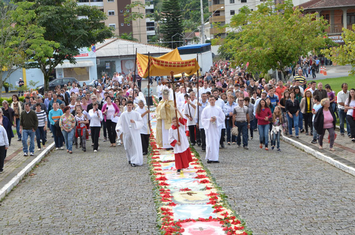 Pedrinho, entre outras, aconteceram celebrações tanto no período da manhã com missas e procissão como à tarde. Em Timbó, na Igreja Matriz Santa Terezinha, os ? éis iniciaram às 5 h, a confecção dos tapetes e às 8h foi realizada a celebração seguido pela procissão na praça em frente a igreja. Neste ano, pela primeira vez a Paróquia Nossa Senhora Aparecida, localizada no bairro dos Estados, em Timbó, realizou a procissão de Corpus Christi. Segundo informações de Ana Paula Manfrini, membra ativa da comunidade, nos três anos que é paróquia, a Igreja sempre fazia as celebrações de Corpus Christi mas a procissão com tapete, este foi o primeiro ano. Os trabalhos foram coordenados pelo padre Ricardo Alexandre Kreutzfeld que iniciou a celebração de Corpus Christi às 8h, na Associação de Moradores do bairro dos Estados, após os ? éis seguiremos em procissão até a Igreja Matriz Nossa Senhora Aparecida, fazendo as 15 estações da Via Sacra Eucarística. Já em Indaial as celebrações de Corpus Christi foram realizadas nas duas igrejas centrais do município. Na Igreja Matriz Santa Inês os tapetes para a procissão iniciaram a ser confeccionados às 5h, sendo que a Missa iniciou às 9h, seguida de procissão e ao meio-dia, foi servido almoço, tendo como cardápio risoto, no Salão da Galeria Santa Inês. Na Igreja Nossa Senhora de Fátima, no bairro das Nações foram realizadas celebrações assim como na Igreja São Francisco de Assis, no bairro Carijós. A procissão de Corpus Christi é um dos momentos mais belos da Igreja Católica pois envolve a comunidade na produção de vários tapetes de serragem colorida, areia colorida e de outros variados produtos que são montados, em um espaço especí? co, para que a procissão de ? éis possa passar por cima e lembrar a caminhada do povo de Deus, peregrino, em busca da Terra Prometida. Em Timbó, durante a celebração na Igreja Matriz Santa Terezinha, o padre Carlos Humberto Carneiro de Camargo, carinhosamente chamado de padre Carlão, explicou aos ? éis que Corpus Christi signi? ca Corpo de Cristo e é uma festa religiosa da Igreja Católica que vem celebrar o mistério da Eucaristia, o Sacramento do Corpo e do Sangue de Jesus Cristo. A festa acontece sempre 60 dias depois do domingo de Páscoa ou na quinta-feira seguinte ao domingo da Santíssima Trindade. “O dia de Corpus Christi é uma data para a