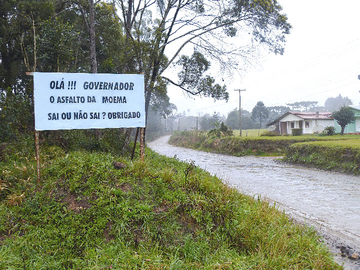 Moradores da comunidade de Moema, em Itaiópolis, instalaram uma placa cobrando a execução da pavi …