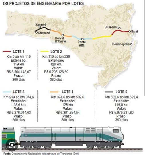 O projeto da nova ferrovia em Santa Catarina, que ligará Chapecó ao Porto de Itajaí, foi detalhado em um mapa recente que divide o trajeto em cinco lotes distintos. Essa ferrovia, de extrema importância para o escoamento da produção catarinense, passará por diversas cidades, incluindo Herval d’Oeste, e será fundamental para o desenvolvimento econômico da região.