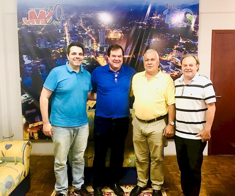 INDAIAL – Lideranças do PP e MDB estão realizando encontros periódicos, visando a união de forças nas eleições municipais deste ano. Esta semana, em visita ao JMV, os presidentes do PP, Anderson Luz dos Santos, o Batata, e o presidente do MDB, Márcio Ferrari, acompanhados pelo vereador Osvaldo Metzner, o Santo Antônio (MDB), revelaram que as conversas estão adiantadas e o MDB até cogita abrir mão de integrar a majoritária em favor de uma coligação maior. Batata é o pré-candidato do grupo e a vaga de vice estaria aberta a uma liderança de partido coligado. “Estamos organizando uma proposta para Indaial e todas as lideranças envolvidas neste processo tem experiência comprovada na administração pública”, disse.