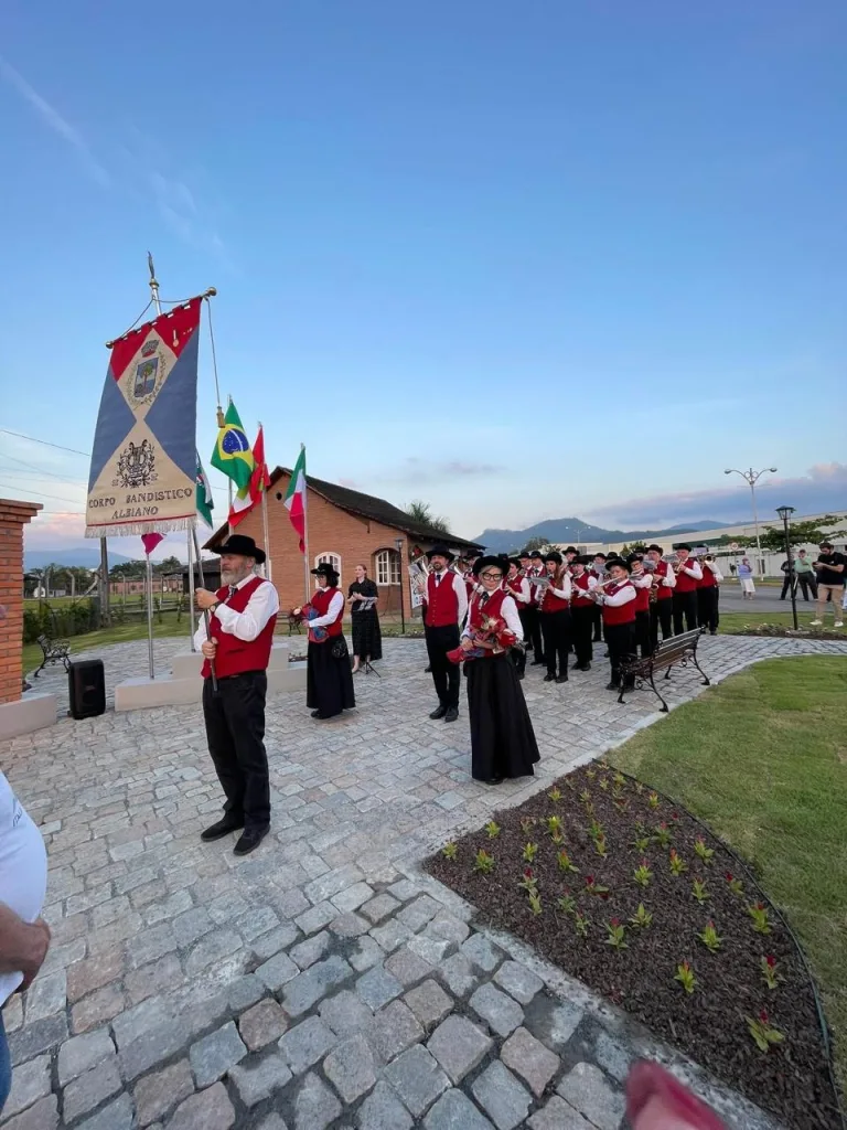Também no dia 14 de novembro, a cidade escreveu outro capítulo memorável com a inauguração da Praça do Sesquicentenário, um espaço concebido como símbolo eterno da presença trentina em Rio dos Cedros. Entre discursos, hinos, aplausos e emoção, a placa comemorativa foi descerrada com inscrições em português e italiano, um diálogo entre as duas pátrias que moldaram este povo. O monumento erguido na praça é mais do que pedra: é memória materializada, é legado concreto, é lugar de encontro, contemplação e identidade.