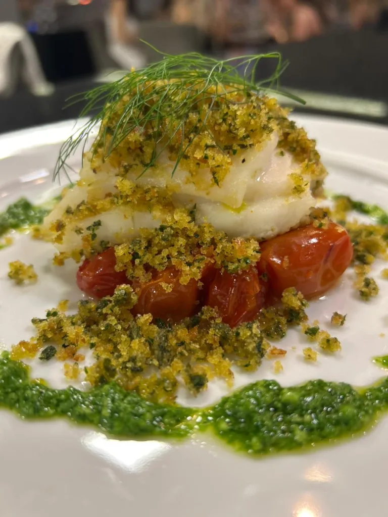 Filés de peixe branco assados, servidos sobre tomatinhos cereja confitados e finalizados com uma farofa aromática de ervas frescas e castanhas, decorados com pesto genovese — um prato leve, perfumado e visualmente encantador.