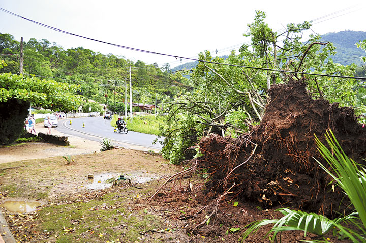 TIMBÓ – As famílias que residem no bairro dos Lagos, em Rodeio, tiveram um grande susto no final da tarde de quarta-feira, dia 8 de janeiro. Apesar de terem escutado durante toda à tarde fortes trovões, não esperavam que um tornado se formaria sobre a localidade e que a sua força arrancasse diversas árvores, que estavam plantadas há mais de 20 anos nas residências. Foram diversas árvores, todas grande com mais de 20 ano que foram arrancadas do chão, duas delas caíram bem próximo de residências e a rua, impedindo a passagem de veículos na pista de quem vai de Timbó para Benedito Novo, as demais estavam localizadas dentro das propriedades rurais. Segundo informações dos moradores da localidade, as famílias estavam em casa e não houve registro de feridos. A Polícia Militar foi chamada e orientou os moradores para que entrassem em contato com a Defesa Civil para efetuar a retirada das árvores, que caíram na região.