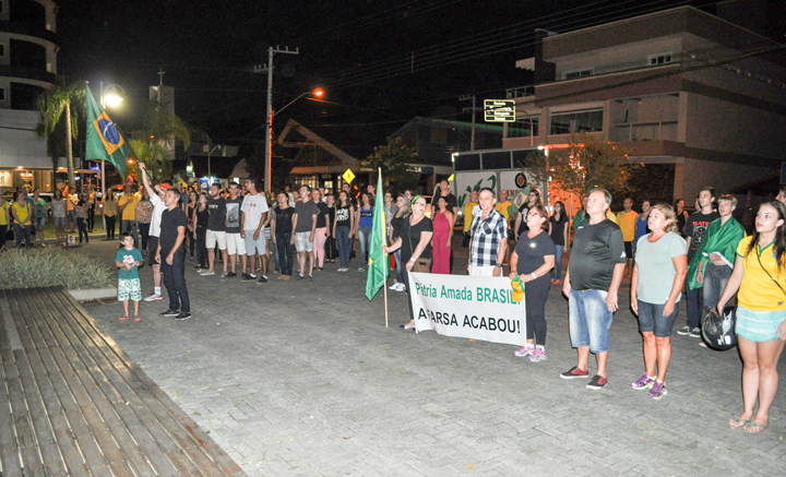 TIMBÓ – Na noite de ontem, dia 17 de março, mais de 300 pessoas, muitas vestidas de preto, com faixas, cartazes e bandeiras do Brasil, estiveram em frente a Prefeitura de Timbó, mostrando toda a indignação em relação ao cenário político do país. O evento foi organizado pelos integrantes dos Movimentos Vem Pra Rua e Brasil Livre, ambos de Timbó. Assim como em Timbó, muitas cidades também realizaram manifestações, após a presidente Dilma Rousseff oferecer o cargo de Ministro da Casa Civil ao ex-presidente Lula Inácio da Silva.