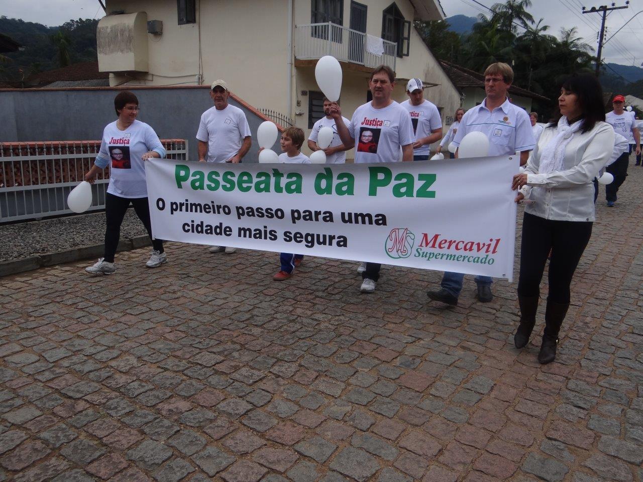 BENEDITO NOVO – A cor branca tomou conta das ruas de Benedito Novo no fim de semana, quando centenas de comerciantes e moradores participaram da passeata pela paz, realizada na tarde de sábado, dia 30. Todos vestiram camisetas brancas, seguravam balões brancos, faixas e seguiram caminhando pela rua Cruz e Souza até a praça em frente a Prefeitura.