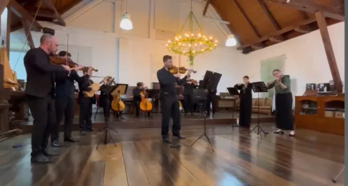 Foi nesse espírito que o Museu da Música de Timbó recebeu um concerto memorável da Orquestra de Cordas da Ilha, que encantou o público com uma apresentação vibrante e gratuita. O destaque ficou por conta da abertura do 1º movimento do Concerto “La Caccia”, de Antonio Vivaldi, obra que transmite toda a energia e o espírito festivo de uma cena de caça. O solo do talentoso Juan Rossi emocionou os presentes com uma interpretação expressiva e envolvente.