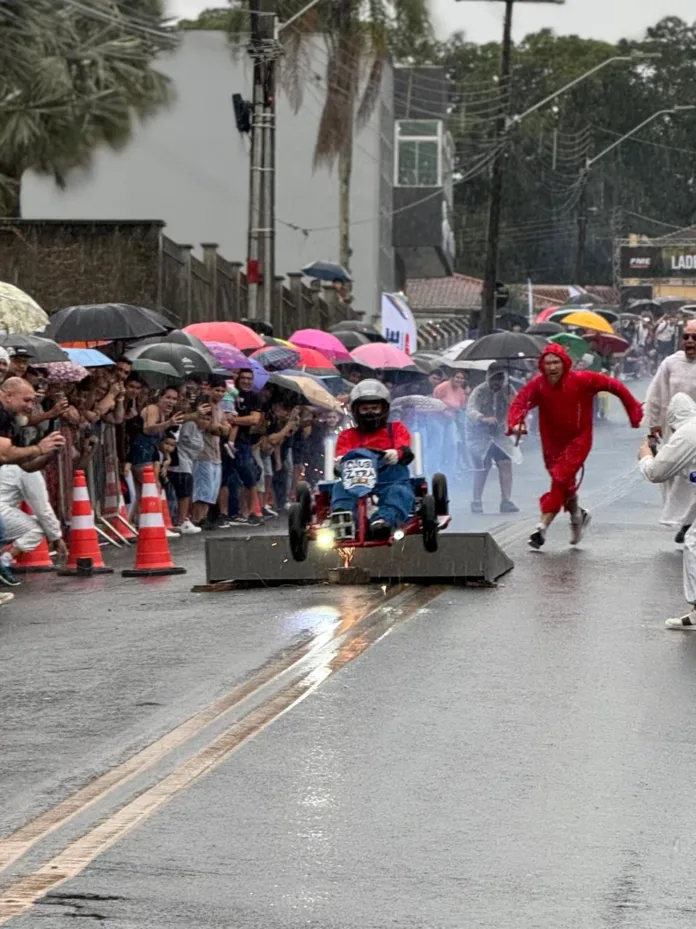 Mesmo com chuva, o público lotou os 300 metros do percurso para acompanhar as descidas dos carrinhos temáticos. Famílias inteiras vibraram com cada apresentação, confirmando o sucesso da corrida de carrinhos “Ladeira Abaixo”, que já se firma como tradição em Indaial.