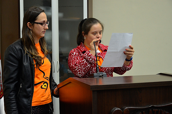 INDAIAL – Fazer o diferente chamando a atenção da comunidade para a importância da conscientização e prevenção às deficiências, sejam elas físicas, visuais, mentais, auditivas ou múltiplas, de caráter transitório ou permanente. Este é o objetivo da vereadora do Parlamento Jovem de Indaial, Jussara Bernardo, ao apresentar o projeto que institui o “Agosto Laranja”. De acordo com informações da coordenadora do Programa do Parlamento Jovem, Maria Helena Theiss, o projeto que foi apresentado na sessão do mês de maio, entrará na pauta e vai a votação no Parlamento Jovem nos dias 7 e 23 de junho, para depois ser encaminhando para a Câmara Adulta para que a Mesa Diretora apresente e seja votado de fato e de direito para que o mesmo se torne Lei.