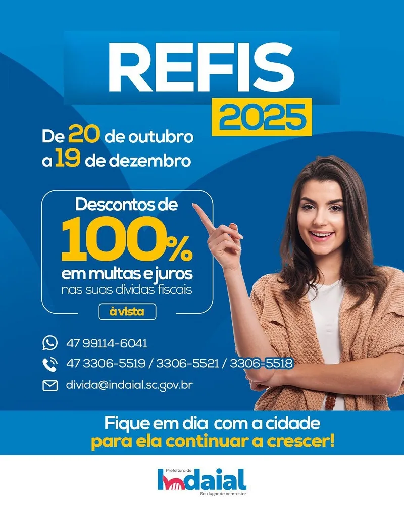 A Prefeitura de Indaial iniciou o Programa de Recuperação Fiscal – REFIS 2025, através do programa, o contribuinte inadimplente pode quitar impostos municipais atrasados, como ISS, IPTU, Alvará, Contribuição de Melhoria e Taxas.
