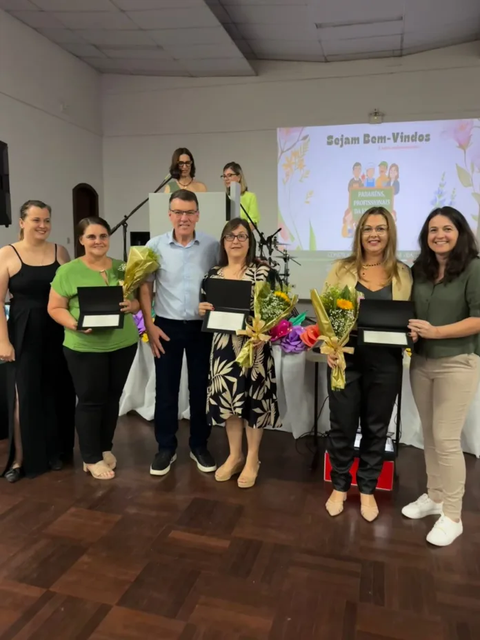 Além da entrega dos livros, a Secretaria de Educação realizou, no dia 14 de outubro, uma confraternização especial em homenagem aos profissionais da rede municipal. O evento ocorreu na Sociedade Antares e celebrou o Dia do Professor com palestra sobre motivação, apresentação cultural, sorteio de brindes e homenagens às professoras Marilete Pisa Poffo, Denise André e Elisa Maria Fava, que se aposentaram após anos de dedicação.