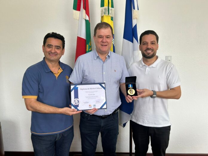 O diretor-geral do Jornal do Médio Vale, Evandro Loes, foi homenageado na manhã desta sexta-feira, 13 de dezembro, com a Medalha e o Diploma de Mérito Cultural Lindolf Bell. A entrega oficial ocorreu na Prefeitura e foi realizada pelo prefeito de Timbó, Jorge Krüger, e pelo diretor-presidente da Fundação de Cultura e Turismo, Jorge Ferreira.