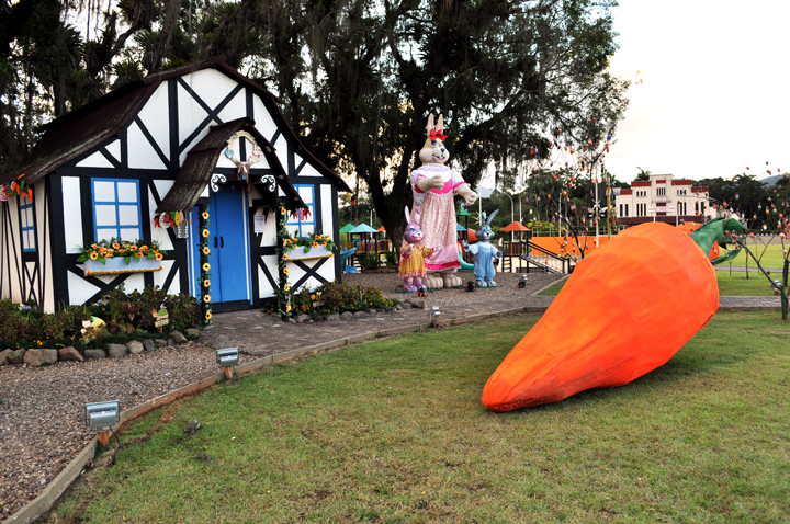 TIMBÓ – A decoração de Páscoa que foi cuidadosamente preparada pelos profissionais da Fundação Cultural de Timbó no Parque Central juntamente com uma programação especial está encantando crianças e adultos. A programação oficial que iniciou no dia 13 de março e seguiu durante a semana conta com apresentações culturais, atividades e também com o personagem principal da Páscoa: o coelhinho, que no Parque está vivo e recebe os olhares encantados das crianças.