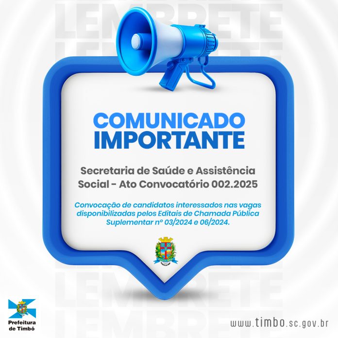 A Comissão de Seleção de Pessoal da Secretaria Municipal de Saúde e Assistência Social de Timbó, conforme o Ato Convocatório nº 002/2025, está convocando candidatos interessados nas vagas disponibilizadas pelos Editais de Chamada Pública Suplementar nº 03/2024 e 06/2024.