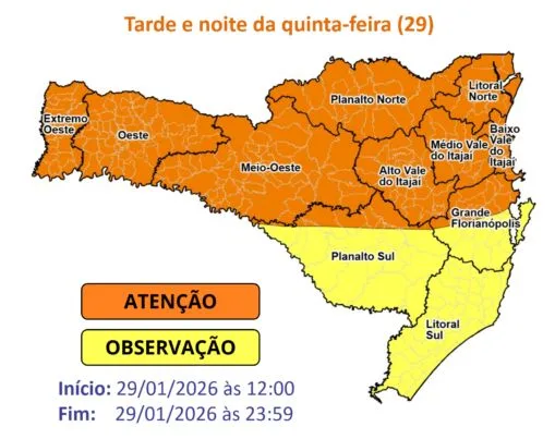 O município de Timbó está em estado de atenção para temporais intensos nesta quinta-feira, 29 de janeiro, conforme aviso emitido pela Secretaria de Estado da Proteção e Defesa Civil de Santa Catarina (SPDC/SC).