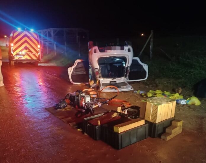 No local, foi constatado que um Fiat Uno Sporting 1.4 capotou após colidir com uma cerca de arame farpado em uma via rural.
