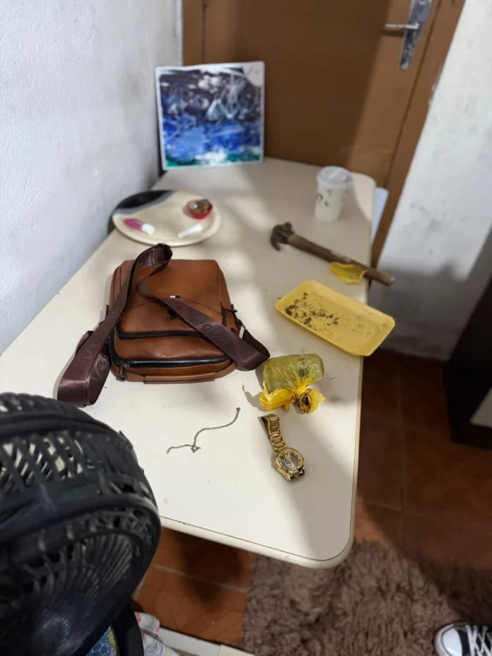 Durante o cumprimento do mandado, os policiais encontraram substância análoga à maconha, dividida em três porções, dentro de uma escrivaninha ao lado da cama do suspeito.