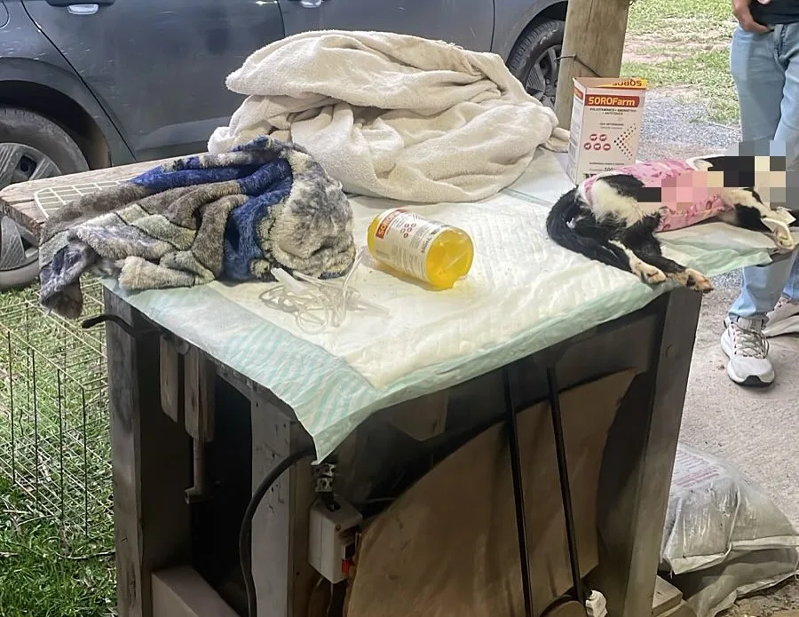 Durante a busca no local, que consistia em um rancho compartilhado com cavalos, foram apreendidos materiais que comprovam o exercício sistemático e habitual de medicina veterinária ilegal. O homem não possui registro no Conselho Regional de Medicina Veterinária. Além do gato morto, foi encontrada uma cadela em pós-operatório mantida em condições precárias, presa por corda curta em local fechado e sem assistência adequada.