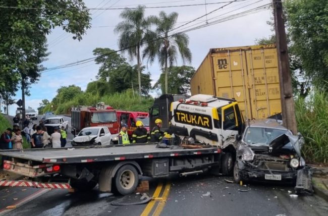 A colisão, que envolveu dois caminhões e três carros, foi registrada por volta das 8h15min, na rua Arno Delling, no bairro Itoupavazinha.