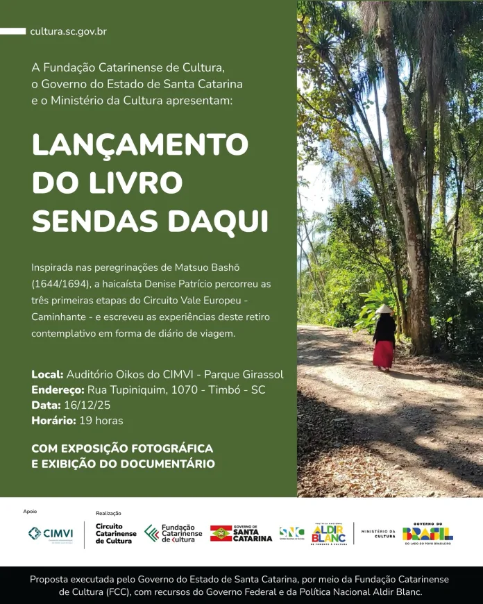 O lançamento do livro Sendas Daqui ocorre às 19h, no Auditório Oikos do Cimvi, no Parque Girassol, em Timbó. A programação inclui exposição fotográfica e exibição do documentário produzido durante o processo criativo da autora. O encontro convida o público a valorizar a cultura regional e a reconhecer o caminhar como gesto de conexão com a memória, com o território e com a própria sensibilidade.