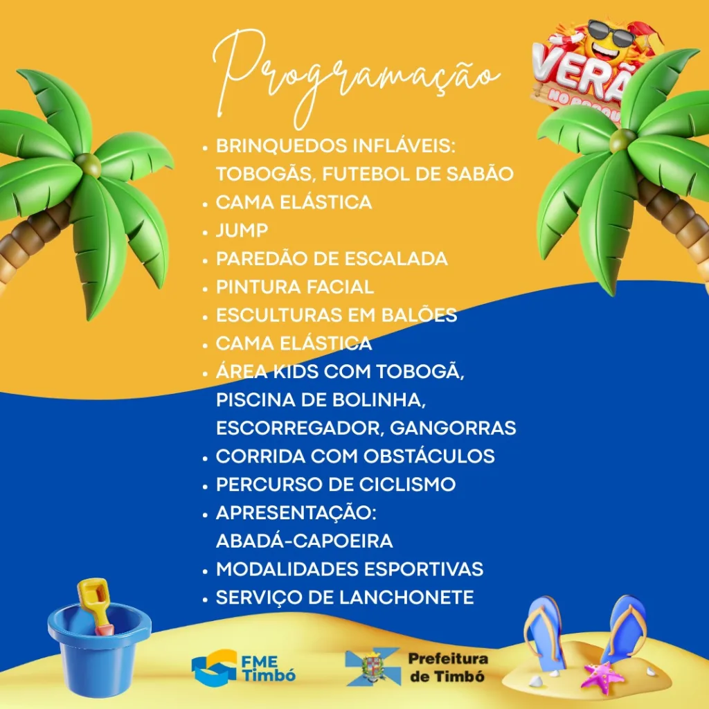 A Prefeitura de Timbó, por meio da Fundação Municipal de Esportes (FME), promove neste domingo, dia 15, mais uma edição do “Verão no Parque”, evento gratuito voltado ao lazer, esporte e diversão para toda a família. A programação será realizada no Parque Henry Paul, reunindo diversas atividades recreativas, culturais e esportivas para crianças e comunidade em geral. O horário será das 15h às 19h.